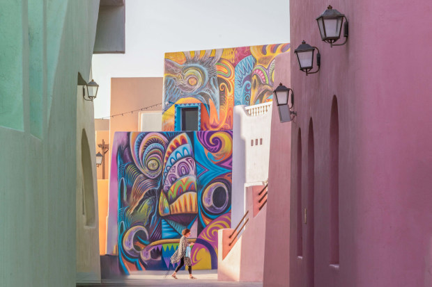 A pastel-lined alley frames a bold urban mural, showcasing how architecture and public art shape the character of the city. The lone walker provides scale and context, highlighting the interaction between people and the built environment in this vibrant urban landscape.