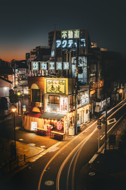 This distinctive building outside Shiinamachi Station is popular for its "Blade Runner" style vibes and neon signage. I used long exposure techniques with this image in order to capture the light trails of a few passing pushbikes and vehicles and to accentuate the neon signage at dusk.
