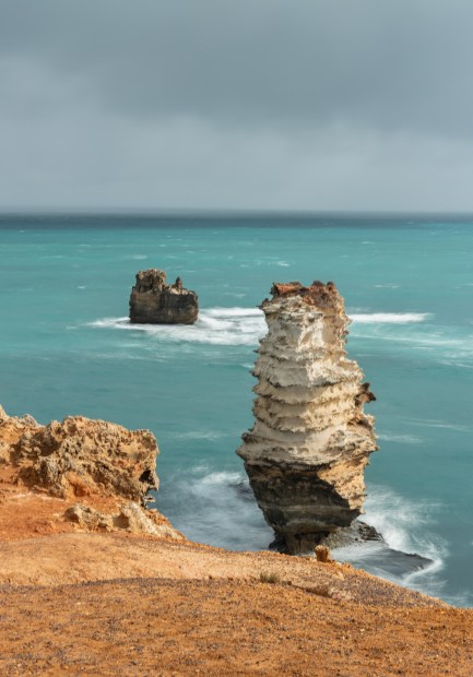A windy day on the beach. The sun lits the rockformation beautifully with the background of dark sky.