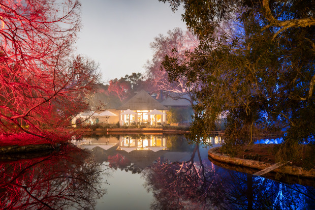 At the water’s edge, a pavilion glows with life, framed by branches washed in painted light. The mirrored surface doubles the display, transforming a quiet garden into a theatrical work of art.