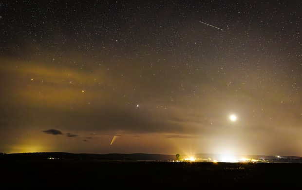 Moon mets stars, mets comet, mets satellite, mets urban lights. Moffatdale, QLD.