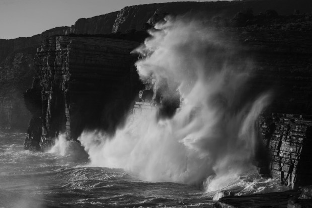 Large southerly swells exploding on sea cliffs at the bottom of the world Located in between Tunnel Bay and Shipsterns Bluff, Tasman National Park, Tasmania, Australia