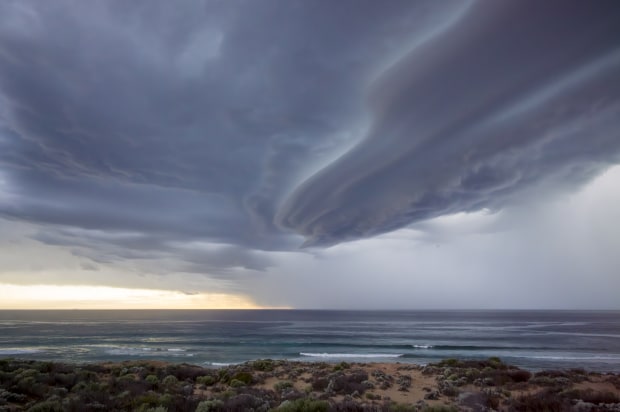 A cloud formation shaped like a bottle-nose dolphin sky dives into the Indian Ocean, Eyre Peninsula, South Australia.