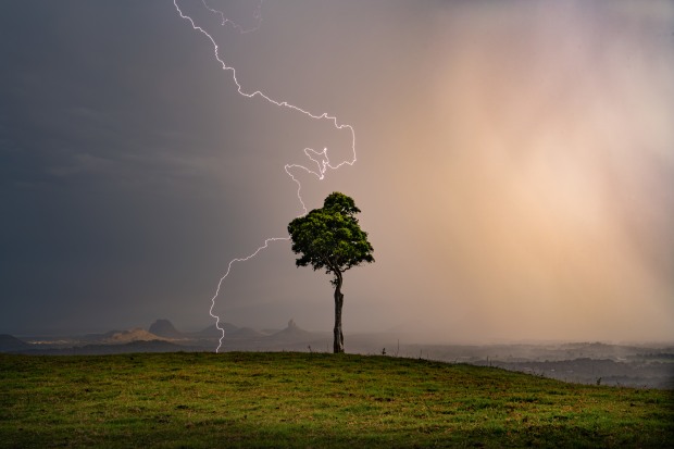It was amazing to watch and capture this lightning bolt dancing around this sour cherry tree, affectionately called One Tree Hill, at Maleny, with the Glasshouse Mountains in the background and the rain bearing down. from the West. Truly magical!