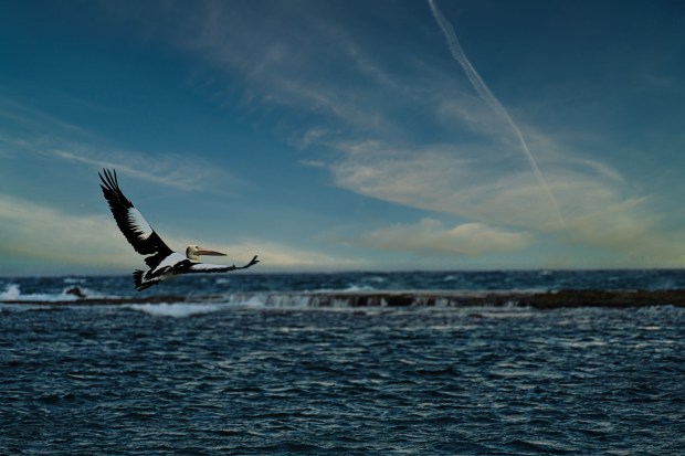 Pelican flying out to sea at Lucky Bay Kalbarri