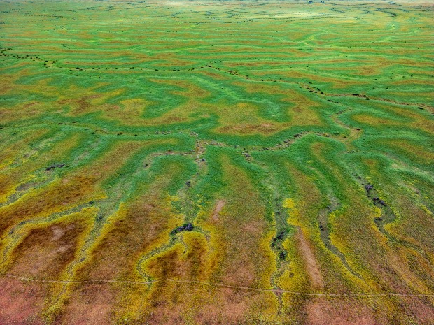 After the flooding rains in outback Queensland, winding channels of vivid green carve their way across the outback plains. Grass replaces the path of receding waterways creating bright ribbons of life that snake through the landscape.
