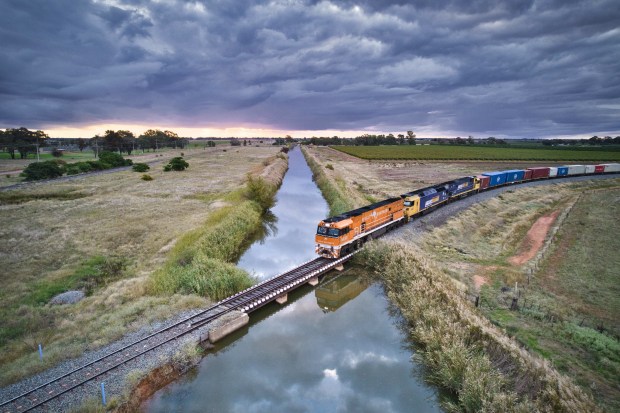 A freight train crosses farmland and an irrigation channel near Yanco, NSW