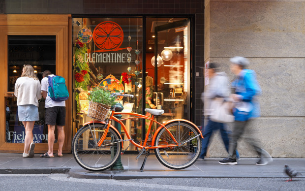 As the bicycle rests in perfect stillness, some pedestrians rush past in a wash of motion, while others stop to ponder a purchase.