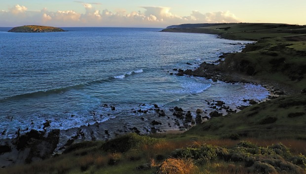 Late afternoon the view from Rosetta Head (The Bluff) towards Waitpinga Cliffs overlooking Petrel Cove contained areas of the coast, including West Island, spotlighted by the setting sun.
