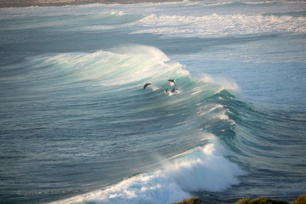 Dolphins playing in the surf at Sugarloaf Rock Western Australia