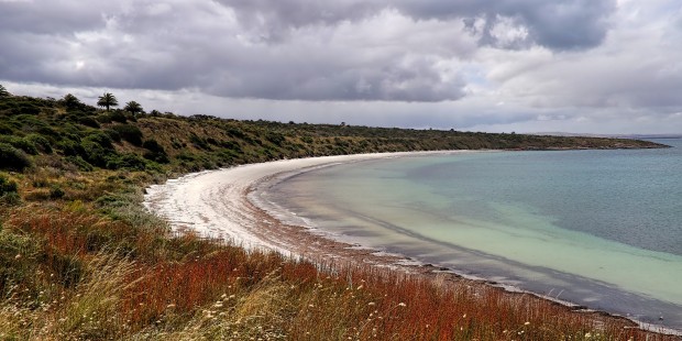 Point Boston beach near Point Lincoln, South Australia, is a dramatic and beautiful sweeping vista of white sand and contrasting colourful vegetation.