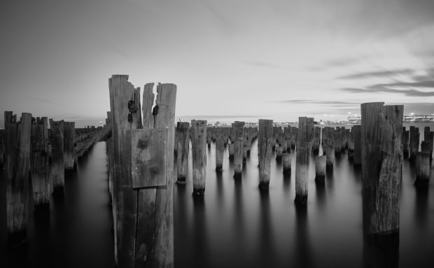 This is a photo of the pylons at Princes Pier in Port Melbourne, taken in April 2021 with an infrared filter.