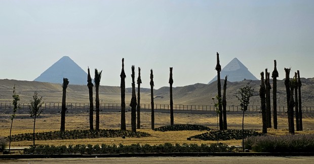 Roadside view to Pyramids through silhouetted palms.