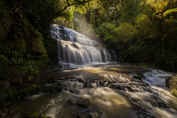 A fleeting sunbeam lights up Purakaunui Falls in the Catlins deep on New Zealand's East Coast.