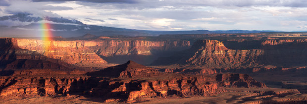 A rainbow appears over the La Sal mountains after a fast moving storm system passes