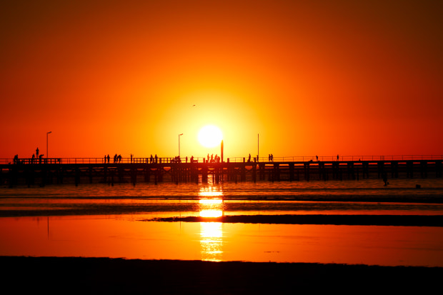 Shot on the Copper Coast of the Yorke Peninsula, South Australia. This burning red sunset captures the silhouette of the jetty with people scattered.