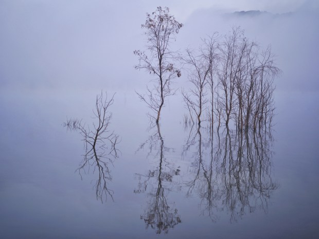 Minimalist of dead bush at Lake Mansfield, Victoria. Captured in a misty morning on a kayak. A hill at the background mostly covered by mist.