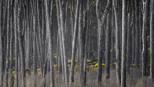 Sidelight and sea haze lights up the trunks of an ancient rimu forest at Bruce Bay, West Coast NZ.
