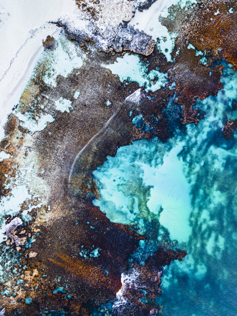 Low tide and dawn light reveal the colours and contours of the West Coast reefs, captured from an aerial perspective.
