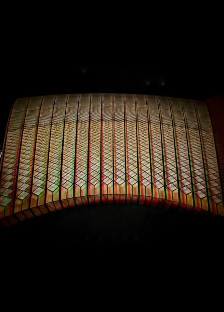 The curved surface of the Sydney Opera House is rendered as a rhythmic band of repeating geometry, illuminated by subtle shifts in colour and light. By isolating pattern and form, the image abstracts the building into a visual pulse, highlighting the craftsmanship and materiality of an iconic urban structure while removing any sense of scale or location.