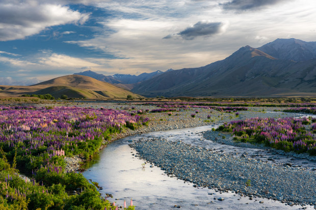 Early morning light moved slowly across the valley as a braided river wound through fields of lupins beneath the surrounding ranges near Lake Tekapo, with shifting cloud revealing brief moments of illumination across the landscape.
