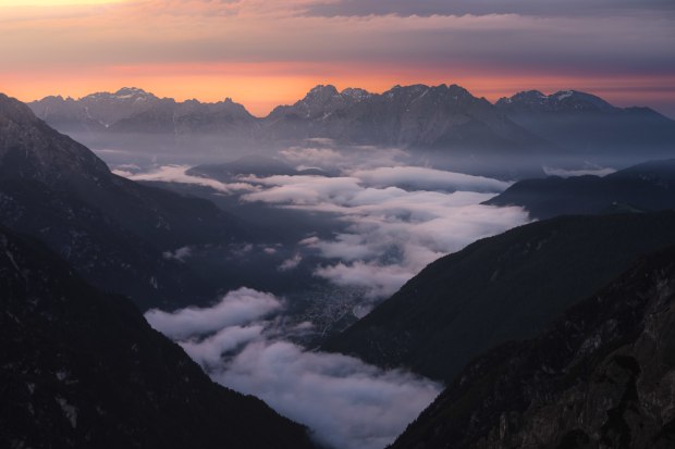 At dawn, low cloud drifts through a mountain valley like a slow-moving river, revealing layers of forested slopes and distant peaks as the first light touches the horizon.