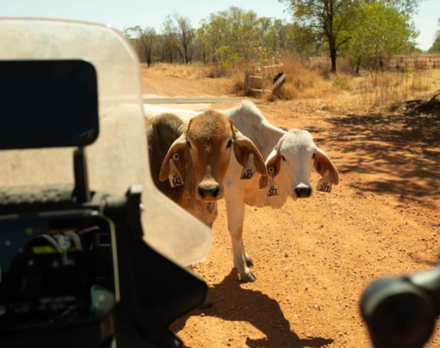 A lone cow strolls across the track in front of my motorbike, framed by the vast Northern Territory landscape. Captured during my Uluru-to-Darwin ride with Dad, this moment sums up the unpredictability and beauty of outback Australia.