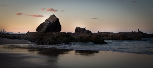 This image is at Currimbum in Queensland close to sunset. The people look like little nomes sitting around the rocks.