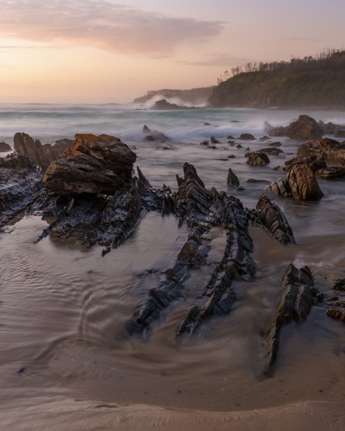 On a sunrise shoot on a secluded back beach near Mallacoota, Victoria, this line of sharp jagged rocks, resembling a crocodile's back, leads your eyes to the swell crashing against the far headland. The big swell added a lot of misty atmosphere to the sunrise. Single frame, long exposure f/11, 1.3 sec ISO 50.
