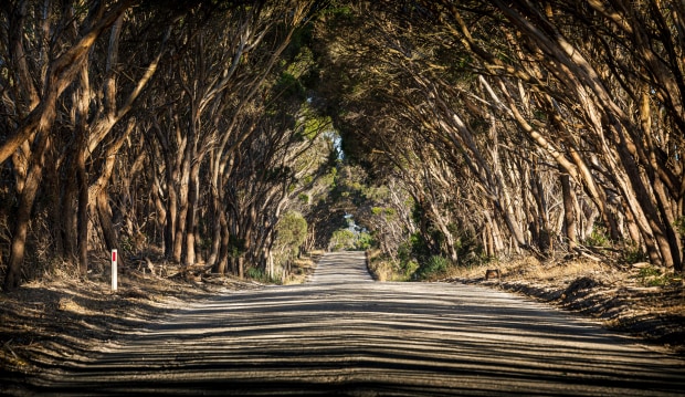 Kangaroo Island is itself a natural wonder. It's an island to be explored by road, from Seal Bay littered with sleepy sea lions to the unimaginably brilliant turquoise waters of Vivonne Bay and the aptly named Remarkable Rocks, perched on a cliff edge only minutes from a colony of fur seals who take turns riding the waves into rock pools at Admiral's Arch. But for me, what made the road trip truly magical were the tree-lined back roads, many which had crowned over to form mystical-like tunnels reminding me this was a truly special adventure. I was taken by the movement and motion of this undulating stretch, and its beauty was literally underlined when I returned late in the afternoon to capture the sun casting golden shadows across my path.