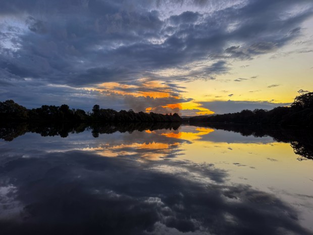 The sunset on the North Arm of the Clarence River, with its dramatic clouds reflected on the water, resembled a Rorschach test. The cane fire intensified the sunset colours on the horizon.