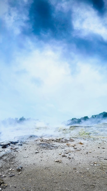 Rain clouds mix with rising steam from the geyser in Te Puia - only half a kilometre of earth's crust separates us from the lava ready to spew into the air from beneath. Salt, sulfur and mineral crystals form the colours of solidified rocks in the foreground.