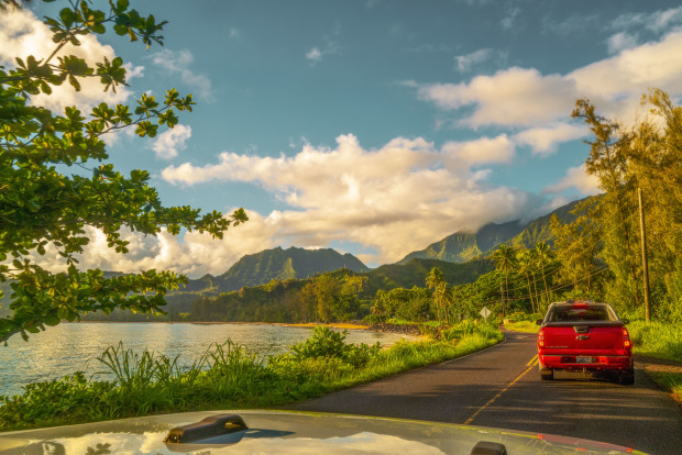 The scenic Hanalei seascape captured along the Kuhio Highway, Route 560 in Kauai a short while after sunrise.