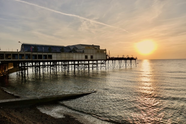 The silhouette of Royal Pier stands strong against an orange glow at sunset, kayakers enjoying the twilight and the fading sunlight reflected in the waves brushing the shoreline.