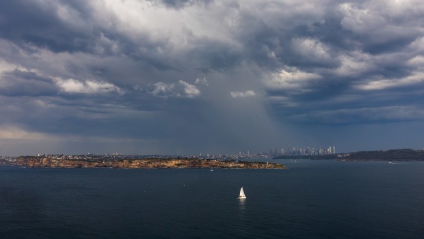 A sailboat returns to Sydney Harbour before a storm rolls in.