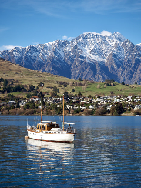 Sail boat nestled amongst the mountains on Lake Wakatipu in Queenstown, New Zealand.
