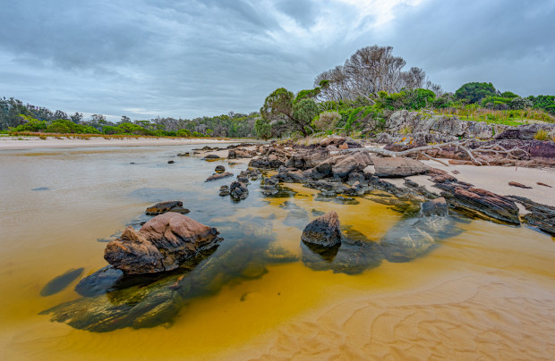 At the mouth of the creek after a king tide and the tannin coloured water from the melaleucas which line the creek.