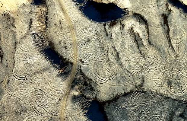 Vehicle tracks on the landscape of a former goldfield in Central Otago. (They aren't allowed on the historic site)