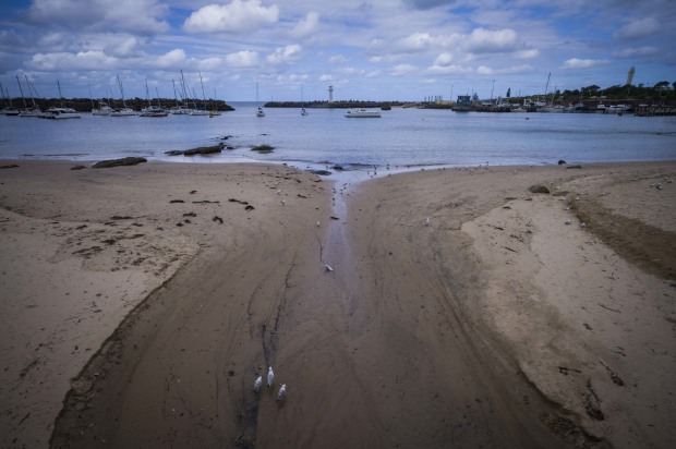 This view of Wollongong harbour has all the classic elements of a seaside view: seagulls, sand, the ocean, boats, and even lighthouses on the horizon. The wet tract of sand where water had recently flown leads the eye into the harbour and appeared to take the shape of a whale’s tail, alluding to the marine life often observed just beyond the harbour.