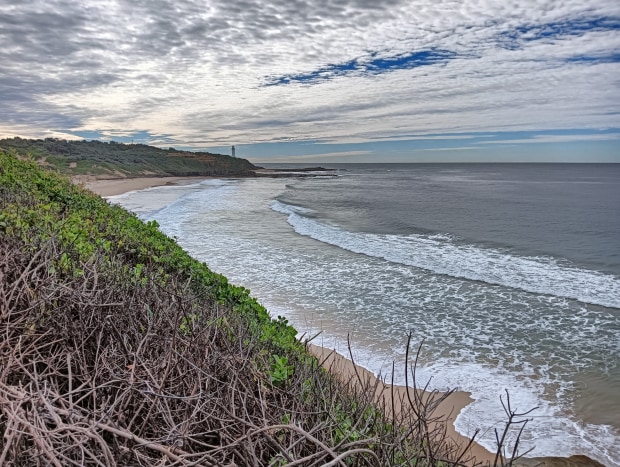Lighthouse on a textured shoreline, with clouds and waves creating depth and movement along the horizon and shoreline.