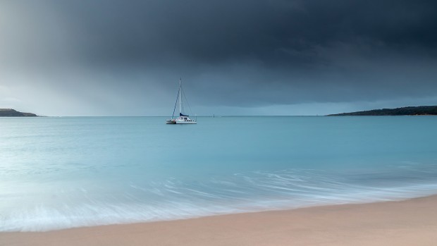 A lone yacht lies at anchor in a sheltered bay, its stillness sharpened by dark storm clouds advancing from the west.