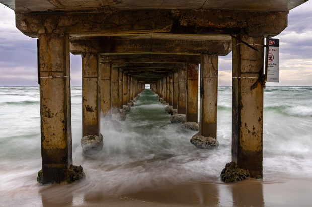 The strong north winds, and the approaching rain squall are creating waves on the bay, which are crashing underneath the jetty around the the pylons.