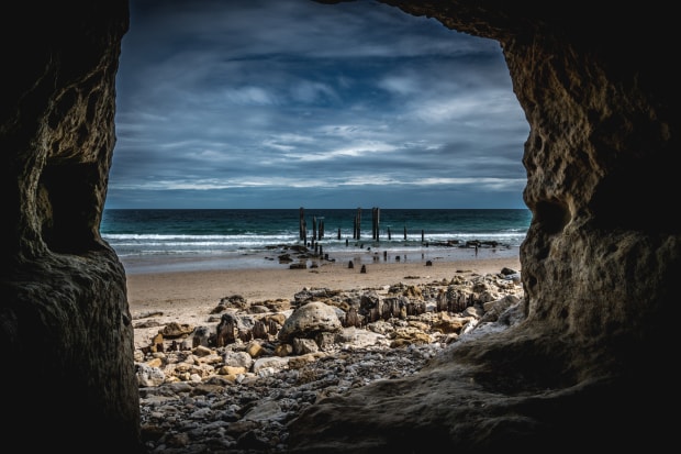 Sitting in one of the old caves that were used by fisherman to store their boats and nets, looking out towards what is left of the old jetty that was built in 1868 waiting for the storm to arrive
