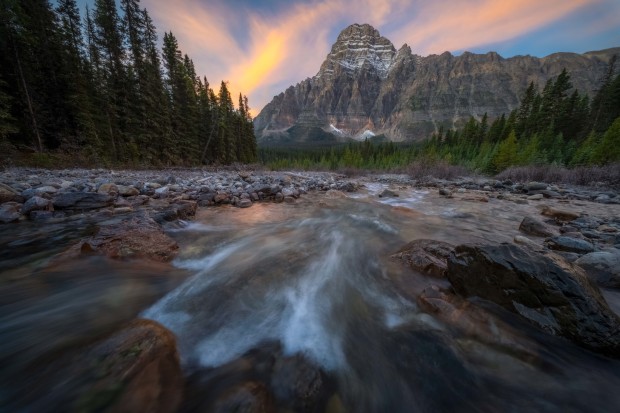 The clouds above Mount Chephren ignite with vibrant colour as the rushing water of a remote mountain stream flows beneath this almighty Canadian peak.