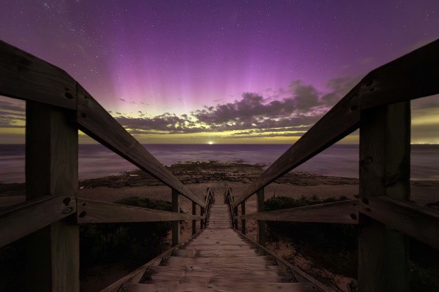 The stairway draws the eye from the dark shore toward a sea and sky that seem to merge, turning an ordinary coastal access point into something otherworldly. I wanted the scene to feel like an invitation to witness the rare moment when an aurora appears above the coast.