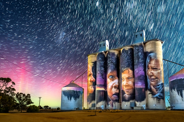 The Aurora Australis glows above Sheep Hill Silos, the star trails mirroring the mural detail, creating harmony between the artwork and the night sky.