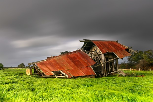 A long exposure creating streay clouds in the sky as a rain squall approaches the abandoned ruins of an old dairy.