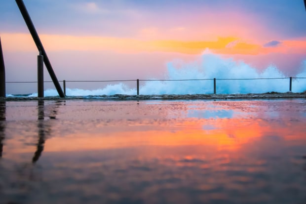 Waves crashing along the ocean pool at Cronulla Beach at dawn