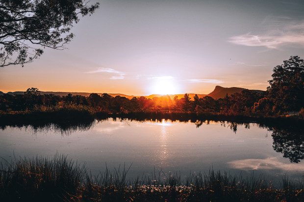 Shot on a family farm in Bogee, NSW, this image reflects the peaceful transition from day to night. The warm glow, still water, and distant peak come together to create a moment of rural stillness.