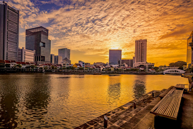 a river view of the setting sun over Singapore. The hour between the night lights and the day ending
